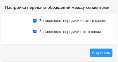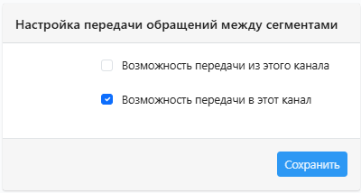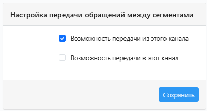 | Сегмент1 может передать в Сегмент2 | --> | Сегмент 1 передает. В настройках канала из которого предполагается передача в другой сегмент укажите следующие настройки | Сегмент 2 принимает. В настройках канала В который предполагается принимать обращения из другого сегмента, укажите следующие настройки |